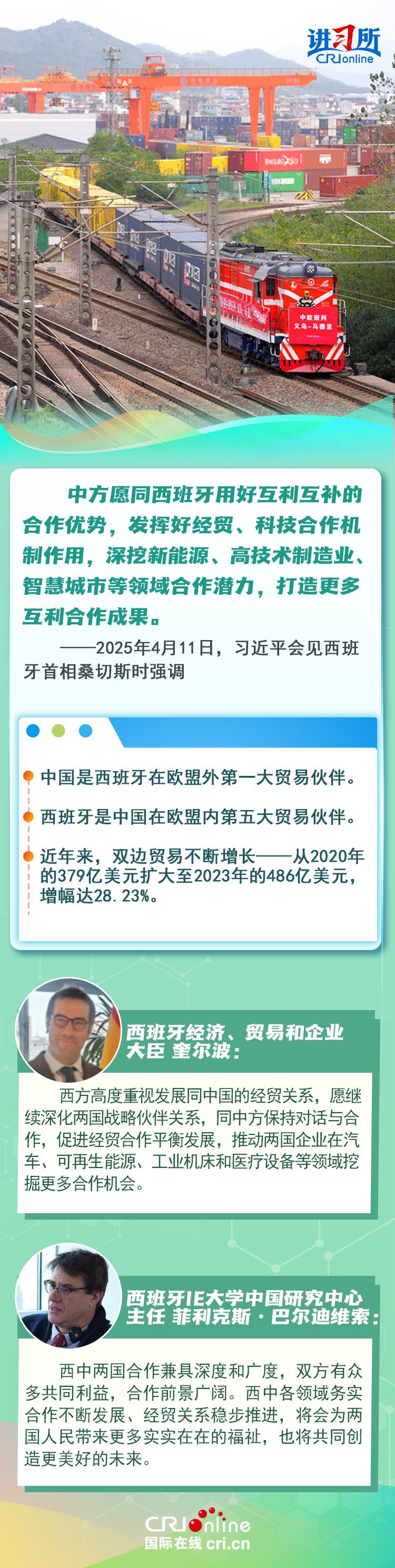 今年是中西全面战略伙伴关系建立20周年,也是中欧建交50周年。多年来,中西两国领导人保持密切互动,秉持互尊互信、互利共赢精神,两国在深化贸易、投资、科技创新、绿色能源等领域取得丰富合作成果,双边关系走在中国同欧洲国家关系前列。在西班牙人士眼中,良好的对华关系对西班牙、欧洲和世界具有重要意义,将会为两国人民带来更多实实在在的福祉,也将共同创造更美好的未来。