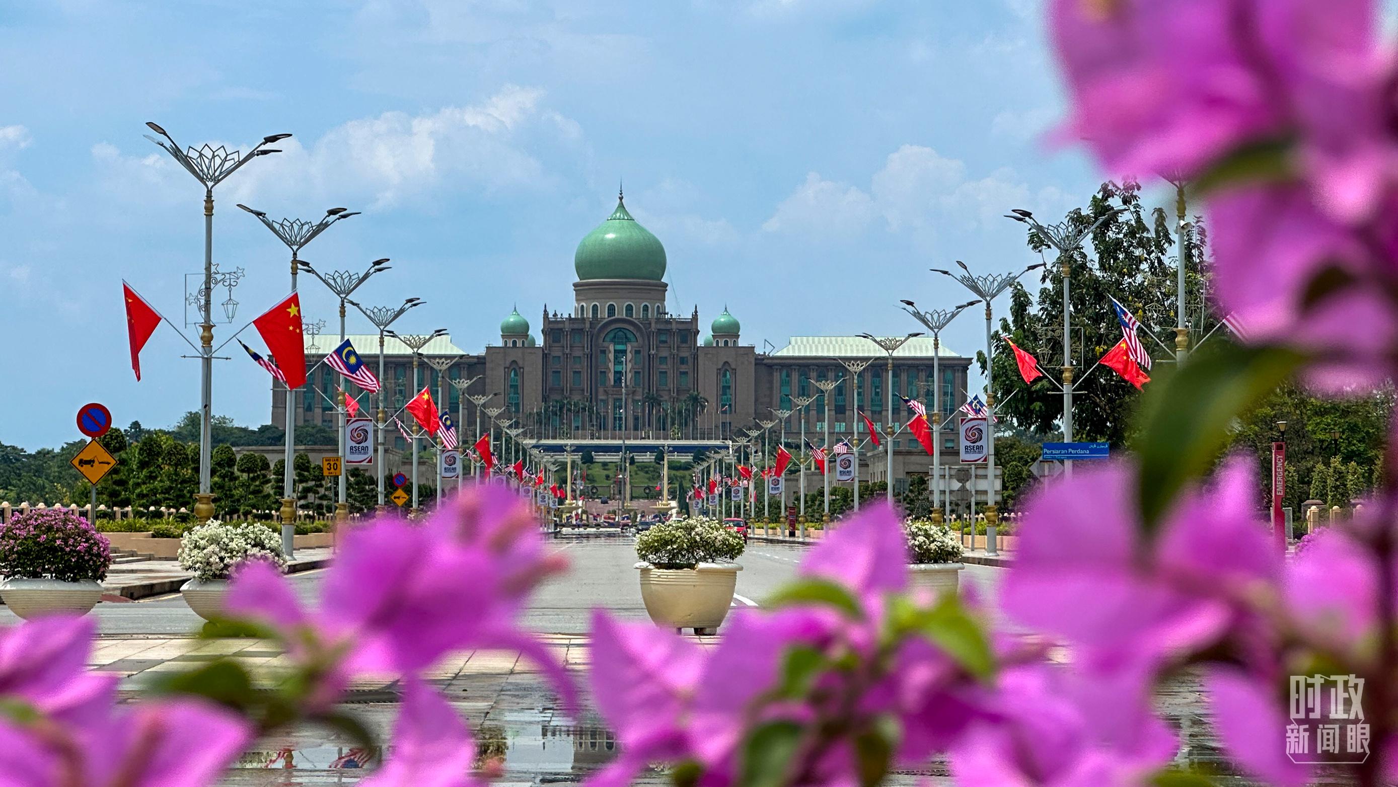 △马来西亚总理府前悬挂的中马两国国旗。(总台央视记者关舟拍摄)