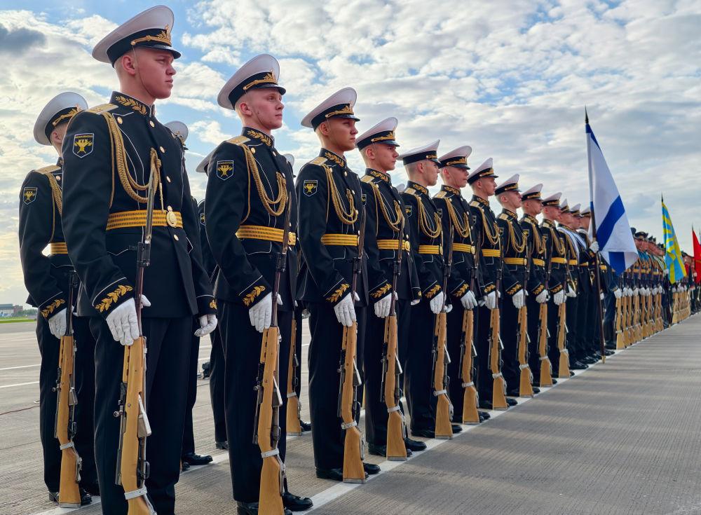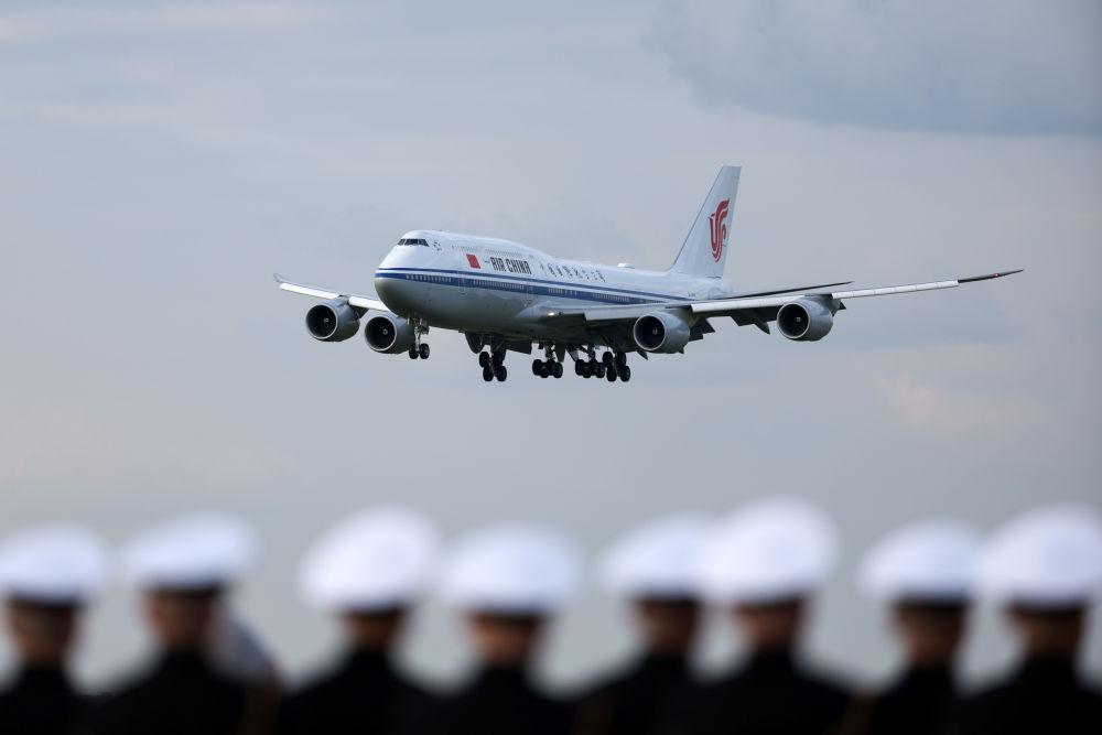 俄方在机场举行隆重迎接仪式。军乐团奏中俄两国国歌。习近平检阅仪仗队并观看分列式。