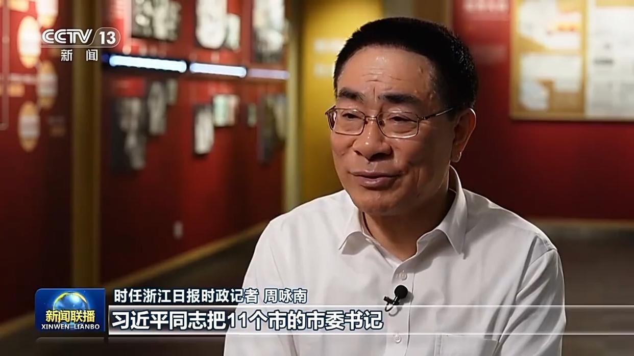 时任浙江日报时政记者 周咏南:习近平同志把11个市的市委书记,把一些企业,把省里的一些有关部门负责人带出去,每到一个地方都与党政领导进行座谈,共商合作交流发展的大计,他每到一个地方都要去看在外经商办企业的浙商,一路调研,一路在思考,浙江下一步怎么发展。