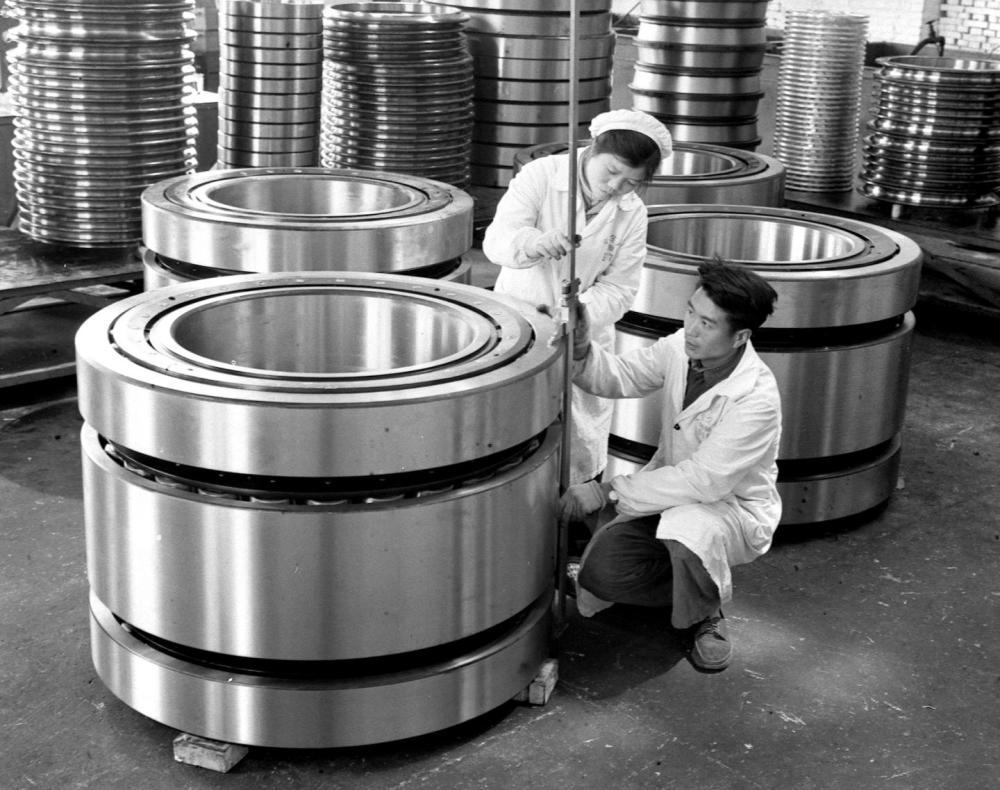 1966年,洛阳轴承厂检验员在细心检查即将出厂的一批特大型轴承的质量。
