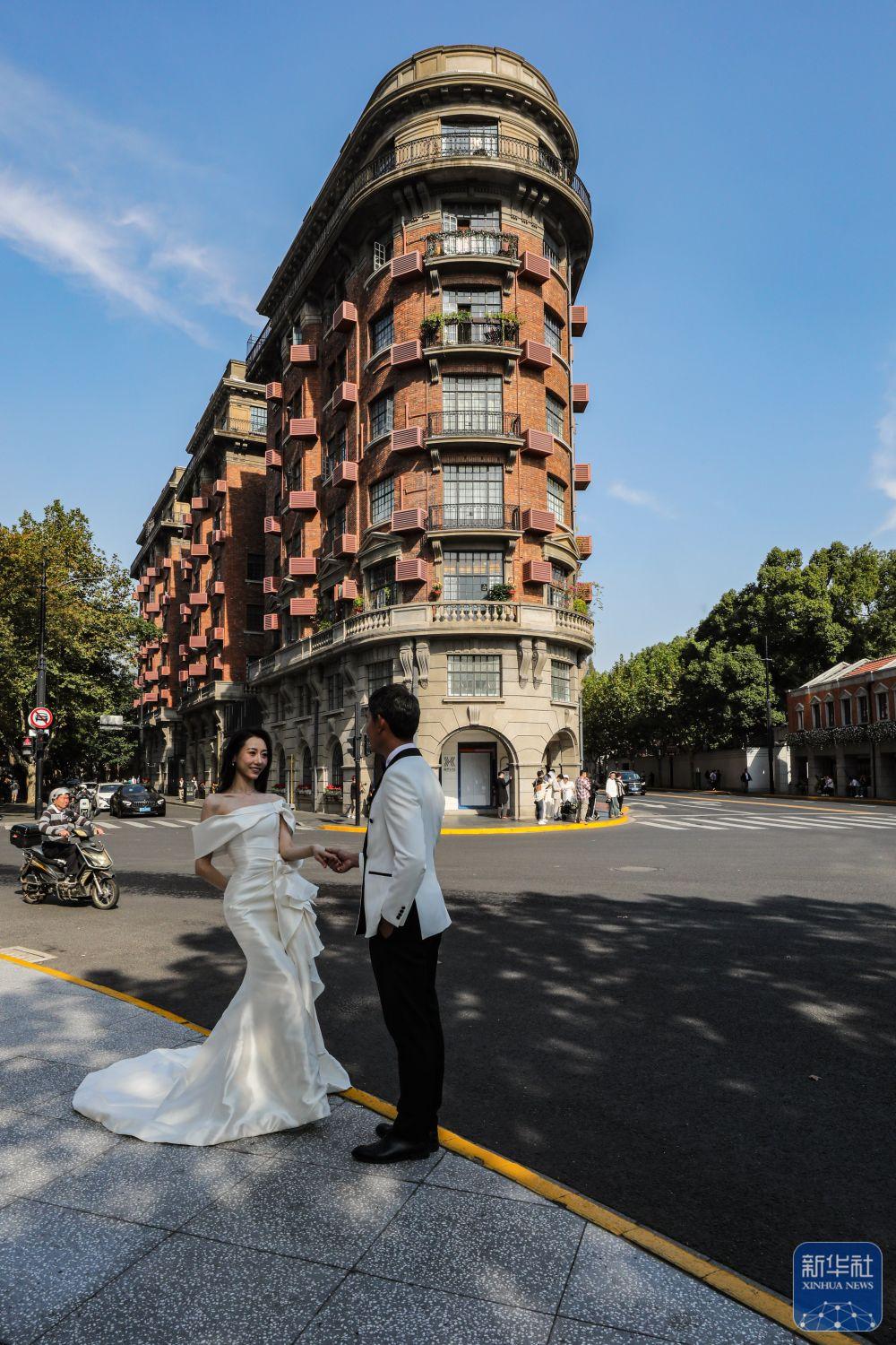 2023年11月3日,一对新人在海派文化的代表建筑武康大楼前拍摄婚纱照。