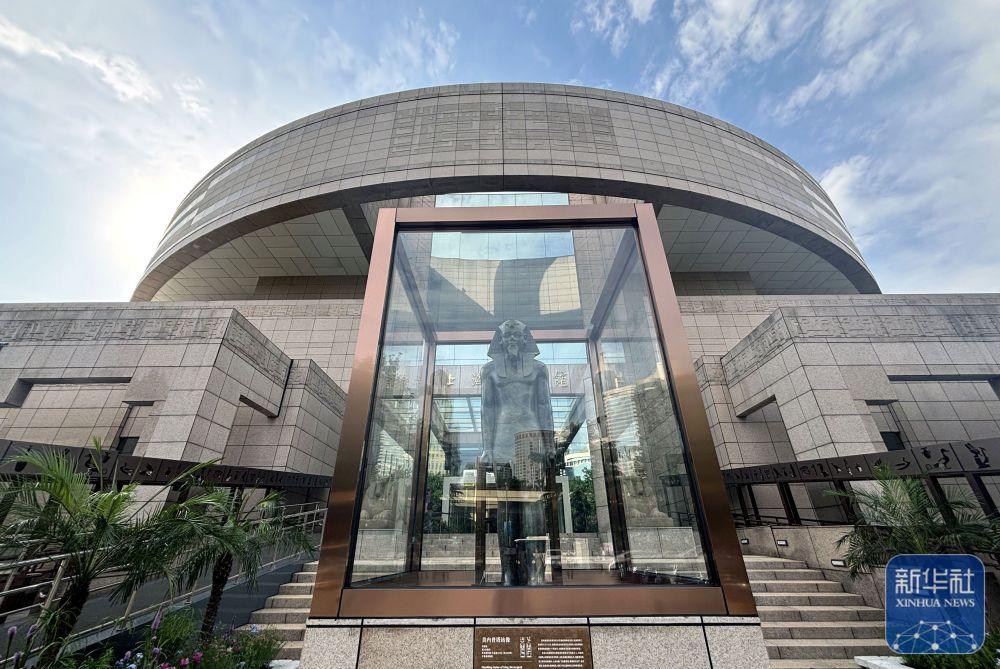 2024年7月17日在上海博物馆人民广场馆南门拍摄的“金字塔之巅:古埃及文明大展”美内普塔站像,这是上海博物馆首次把文物展品放在室外展出。该展是近20年来埃及在境外举办的最大规模文物展,其中95%以上的文物是首次来到亚洲,于2024年7月19日正式向公众开放,将持续至2025年8月。