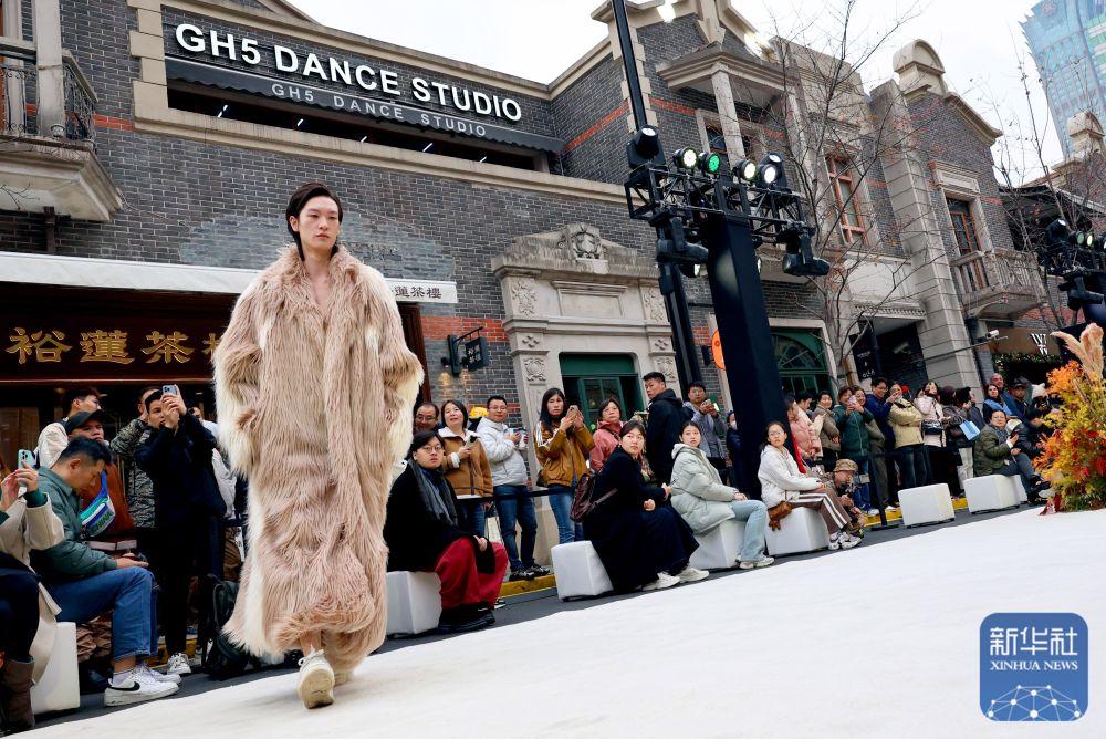 2024年12月7日,模特在“海·派张园时尚文化周”中国青年设计师时装秀上展示设计师服装作品。时装秀以张园建筑主色调与设计线条为灵感,百年石库门建筑群落为背景,将茂名北路作为T台秀场,独具上海特色。