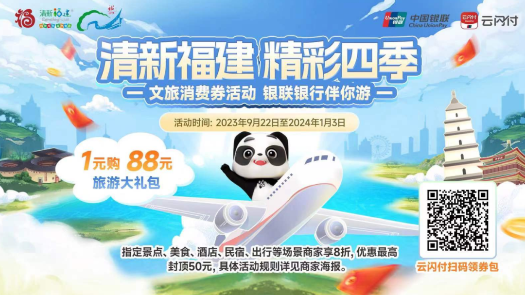 为持续推动文旅消费,2023“有福之州 福派民宿”主题活动主办方特别联合中国银联福建分公司为市民和游客带来“潮能顽夏,百万计划”福派民宿促消费活动,在9月22日民宿主题活动启动仪式上正式发布,“1元购88元优惠券包”“云闪付支付满百享8折优惠”等优惠政策将正式上线,超大力度补贴,邀请广大市民游客超“惠”游福州。想卡点抢优惠的市民朋友们,不妨提前下载好“云闪付”,以免与优惠失之交臂!