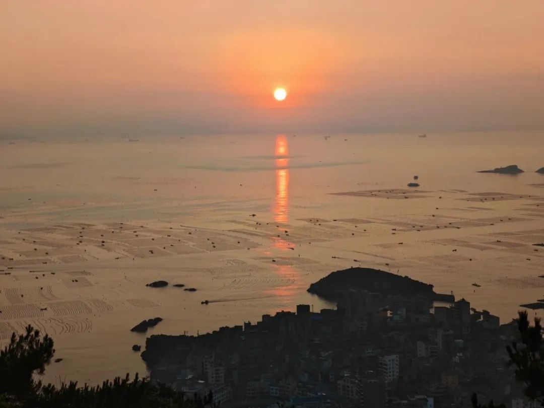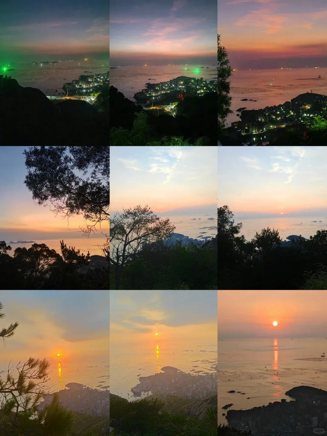 沿着蜿蜒的阶梯,攀上旗冠顶。此时,天边尚沉浸在一片蓝紫色中,海面上,薄雾轻绕,渔舟点点,宁静而祥和。