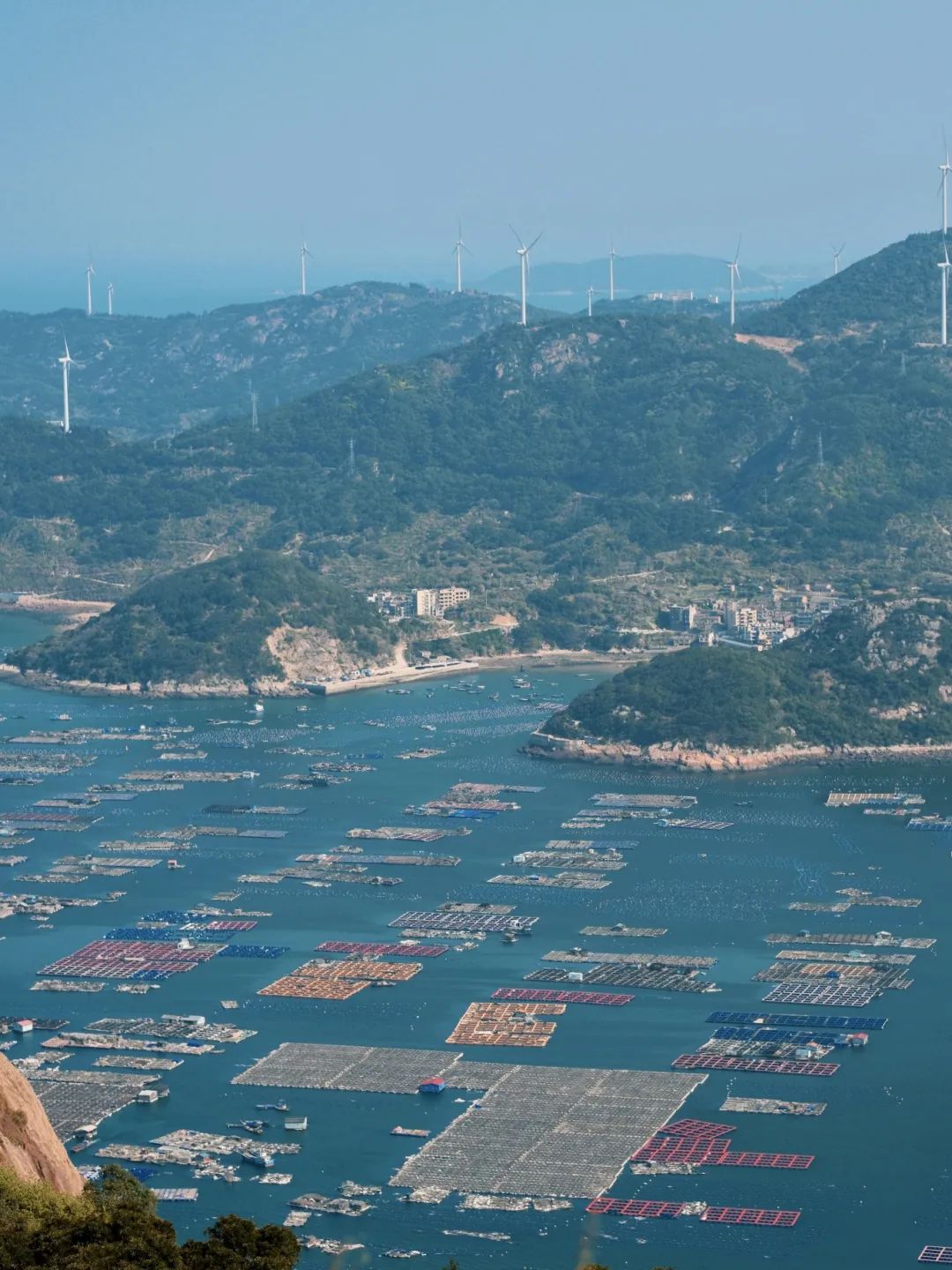 随着时间的推移,远处青山层层叠叠,风车在云雾中旋转,近处广阔无垠的碧蓝海域上,渔排密密麻麻,逐一展现在眼前。