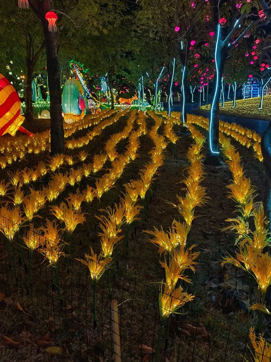 黄金麦田在灯光的照耀下泛着诱人的金黄色,一片丰收的景象跃然眼前,传递着沉甸甸的丰收喜悦。