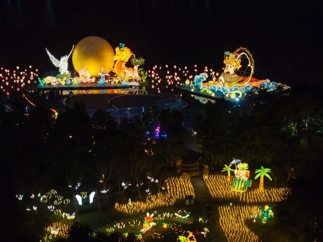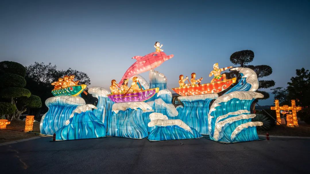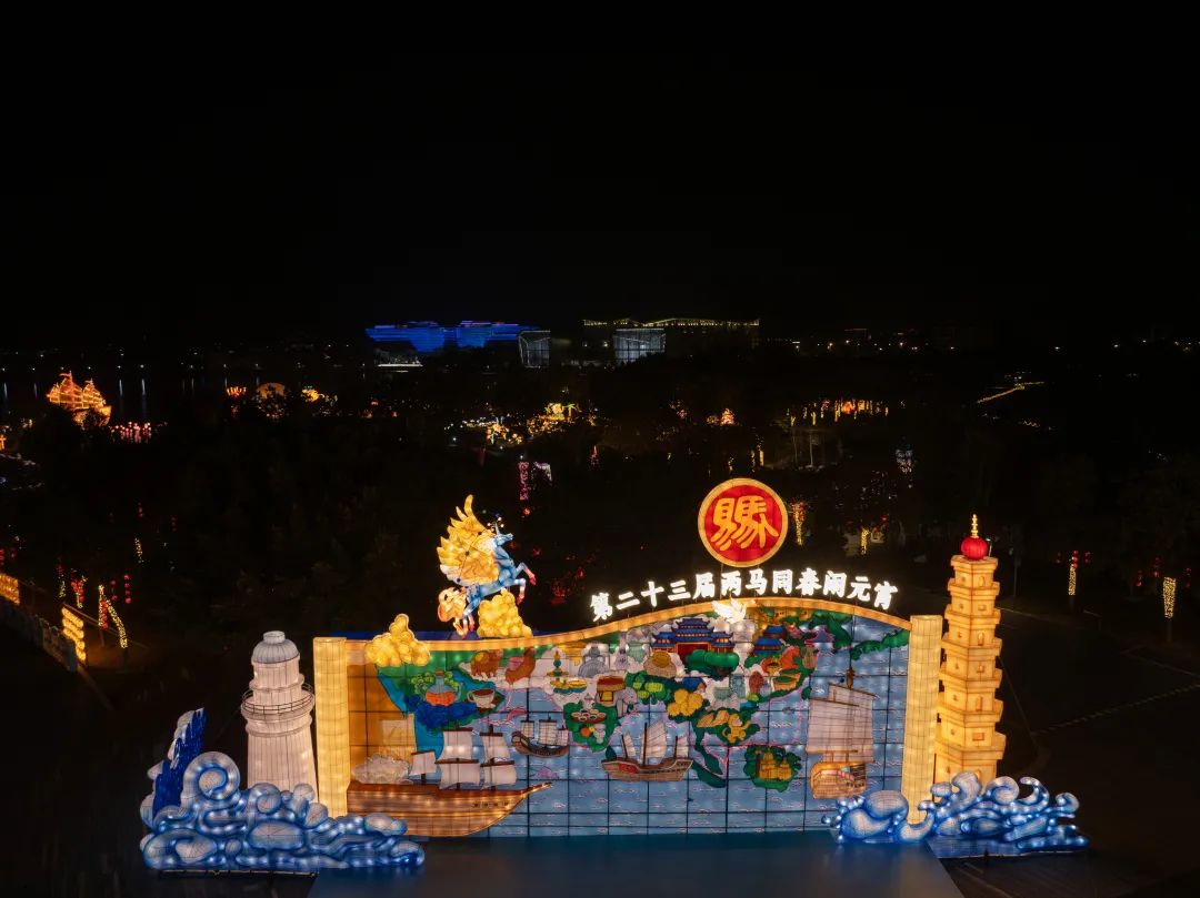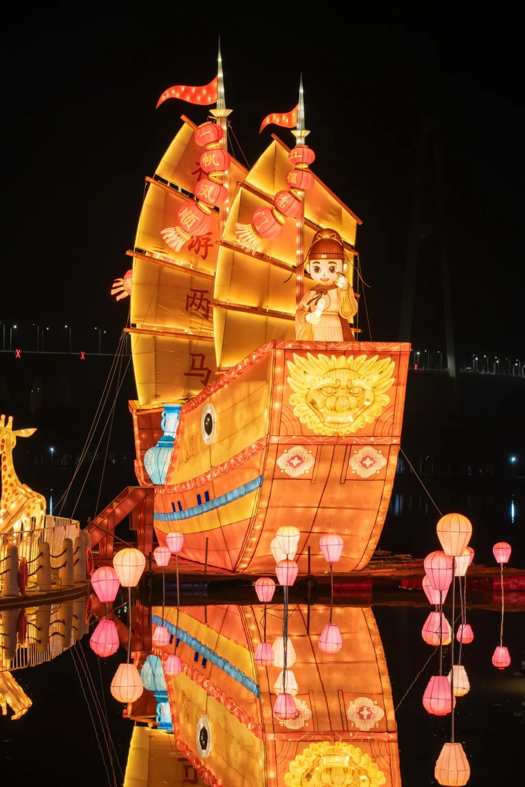 湖面上,“七下西洋”“琅岐生明月、两马共此时”“国泰民安”三组超大型灯组依次铺展,宛如一幅流光溢彩的灯火长卷。