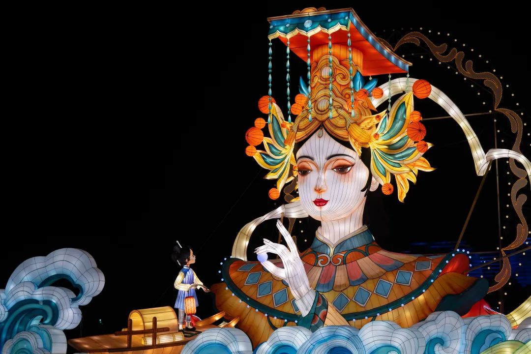 “妈祖”灯组矗立在红光湖中央,璀璨的冠冕与霞帔在夜色中更显庄严。