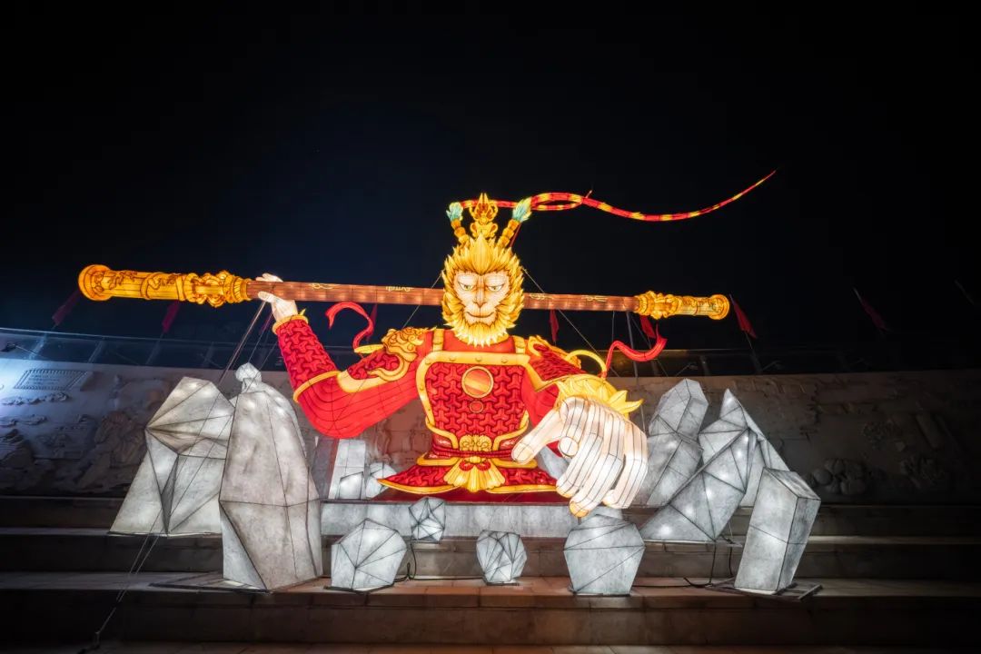 一尊破墙而出的巨型孙悟空灯组气势磅礴,他身披铠甲,手持金箍棒,威风八面,霸气十足。