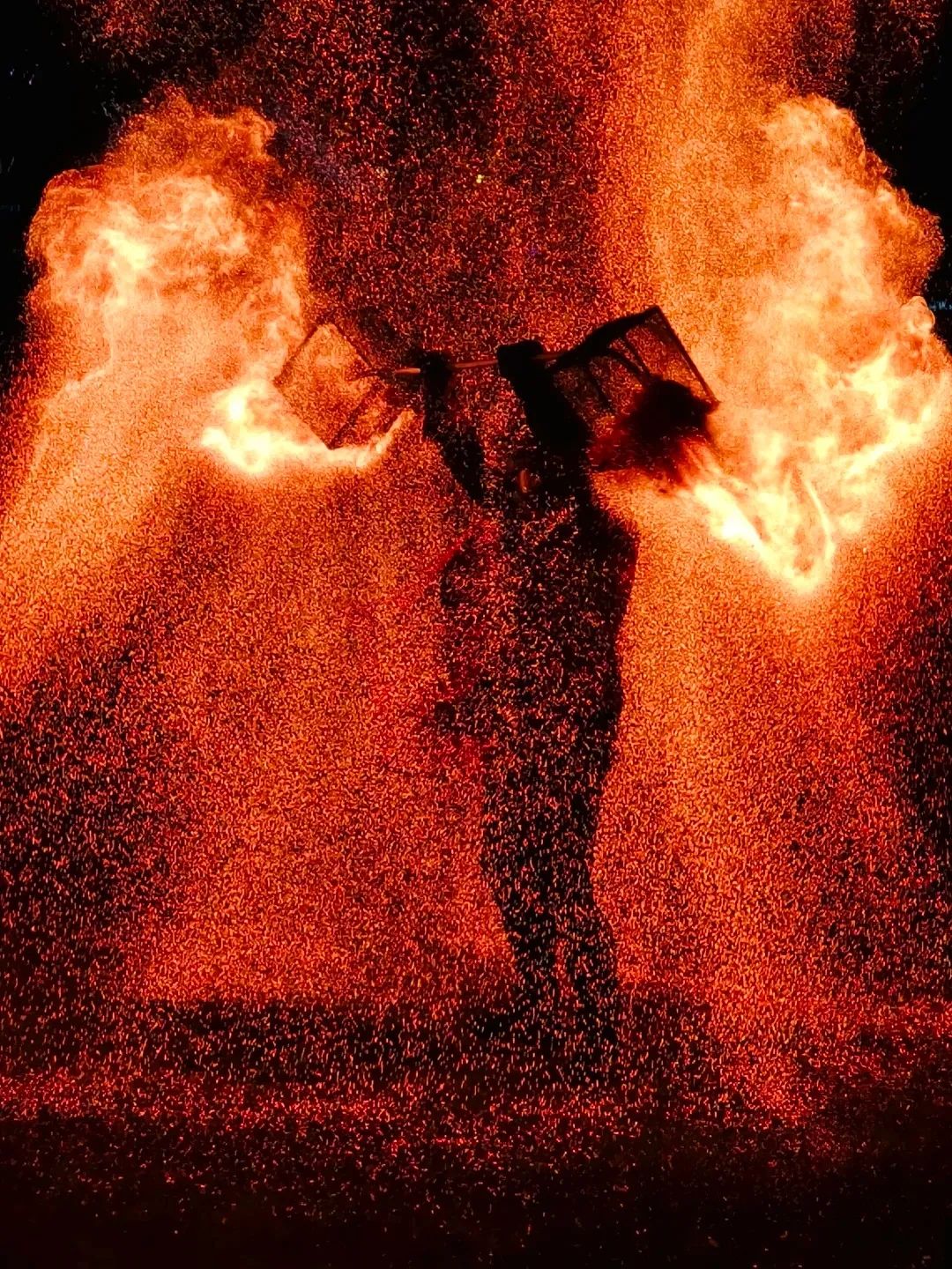 火壶表演者们轻巧地旋转着火壶,一缕缕细长的火苗从壶嘴处冒出,寄托着大家火除邪祟、百家安宁的美好愿望。