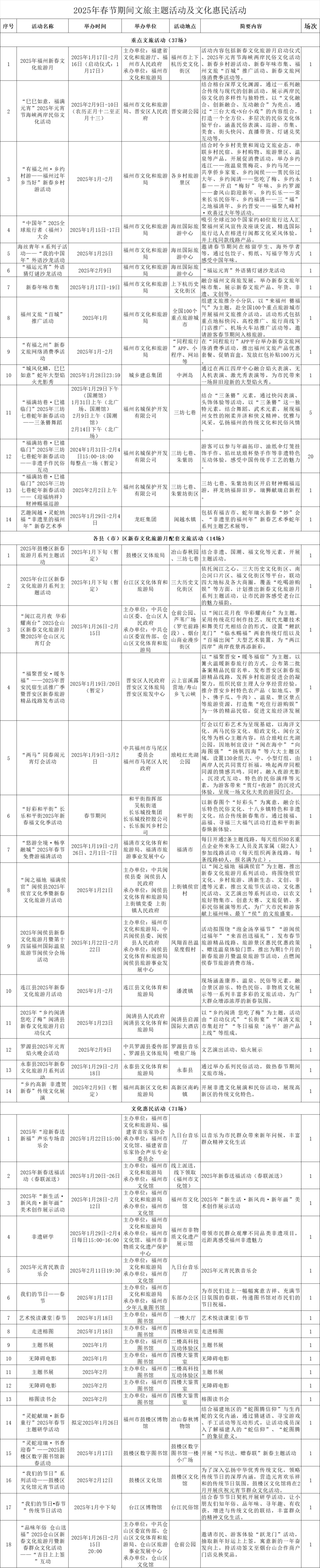 “有福之州·乡约村游——福州过年乡当好”新春乡村游活动于1月-2月在福州各乡村旅游景区举办;2025烟台山百福盘山新春特别企划于1月-3月在烟台山商业漫步街区举办;2025年马尾船政文化园春节嘉年华系列活动于1月29日-2月4日在中国船政文化城举办;“梅”好鼓山 寻“贤”迎春——2025鼓山新春梅花行进式剧本游活动于2月1日-2日在鼓山举办。