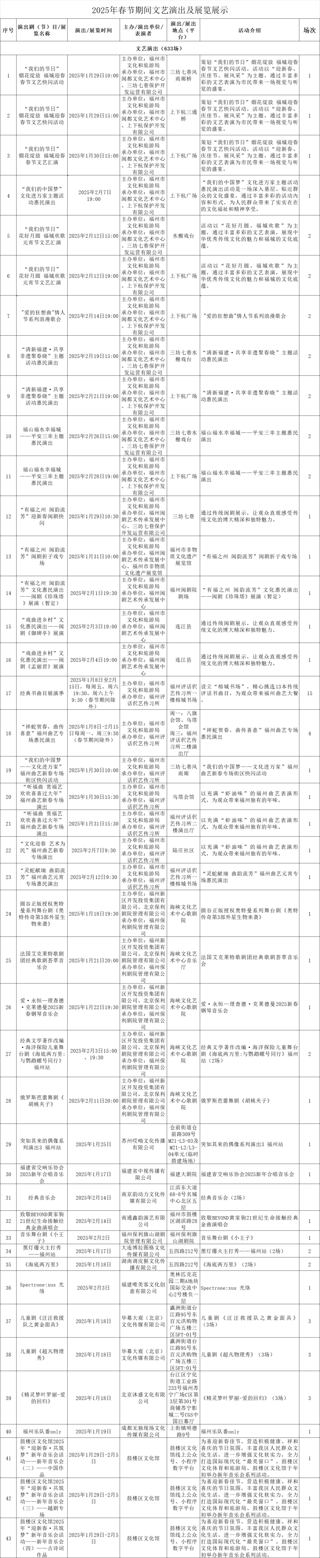 新春文化旅游月期间,福州市属文艺院团、文化馆、名城公司、保利剧院等积极组织开展“我们的节日”烟花绽放 福城迎春——春节文艺快闪活动、“我们的节日”花好月圆 福城欢歌——元宵节文艺汇演、“有福之州 闽韵流芳”闽剧折子戏专场、“我们的中国梦——文化进万家”福州曲艺新春专场街区快闪活动等633场文艺演出,涵盖闽剧、评话、伬艺、歌舞、音乐会、演奏会、话剧、舞台剧、杂技等多样化选择。此外,景区内,《寻梦闽都》《最美茉莉花》《唐朝诡事录·西行》《风起末园》《最忆船政》等沉浸式演艺持续开展,丰富市民游客的节日文化生活。