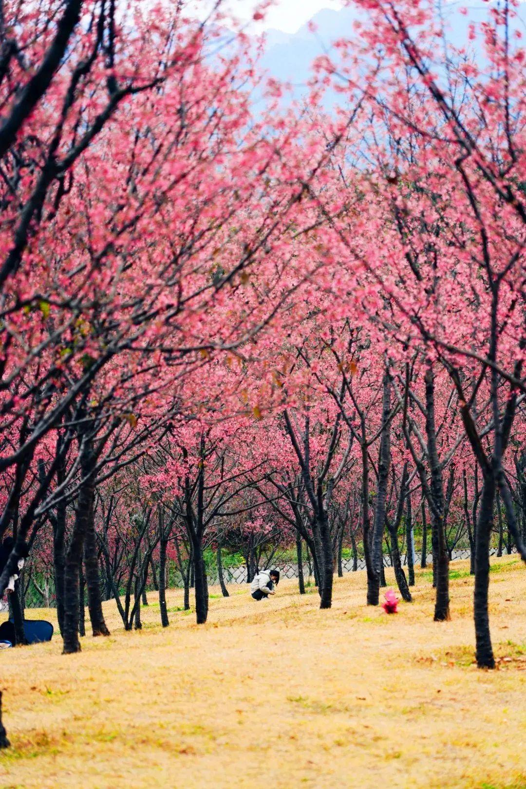 你可以坐着摆渡车沿龙潭瀑布前行,樱花林织就粉色云海,花瓣与翠叶相映,倒影在湖面绘出斑斓山水图。