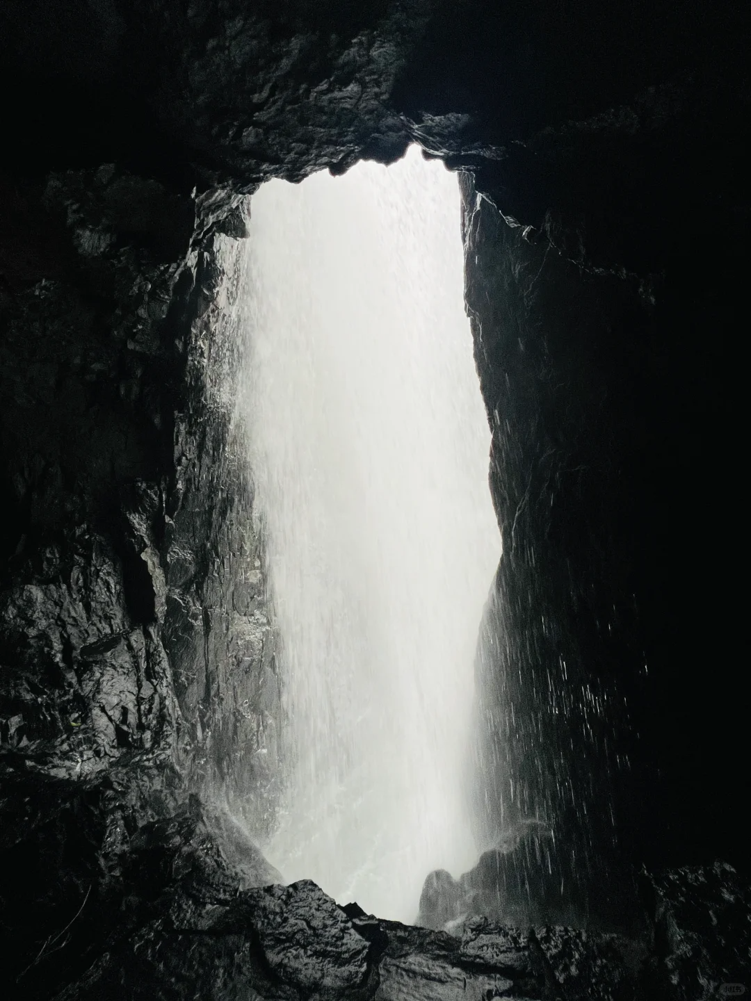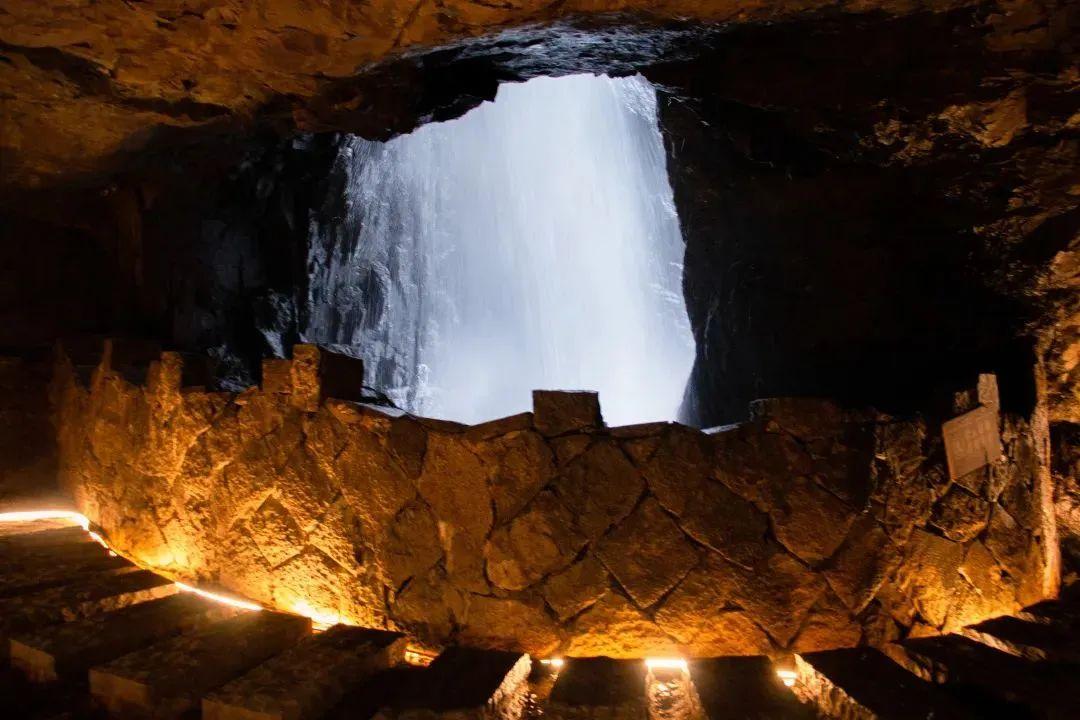 瀑布之下藏着神秘的藏龙洞。远远望去,洞口紧贴着瀑布,汹涌的瀑布在洞口形成密闭的水帘,石洞就隐匿其中。