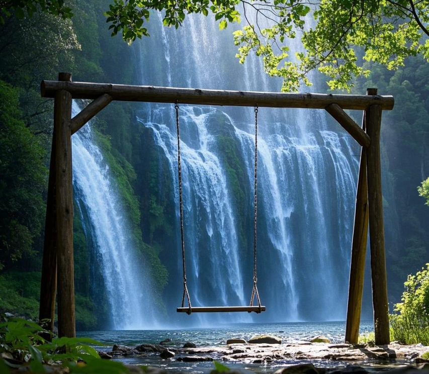 天地之间,飞瀑之旁,秋千在微风中悠然轻晃。当你坐上秋千,眼前是壮观的瀑布,耳边是水流的轰鸣,身心沉浸其中,视野也随之开阔,仿若将这一方山水的灵秀之美尽收眼底,惬意之感漫上心头。