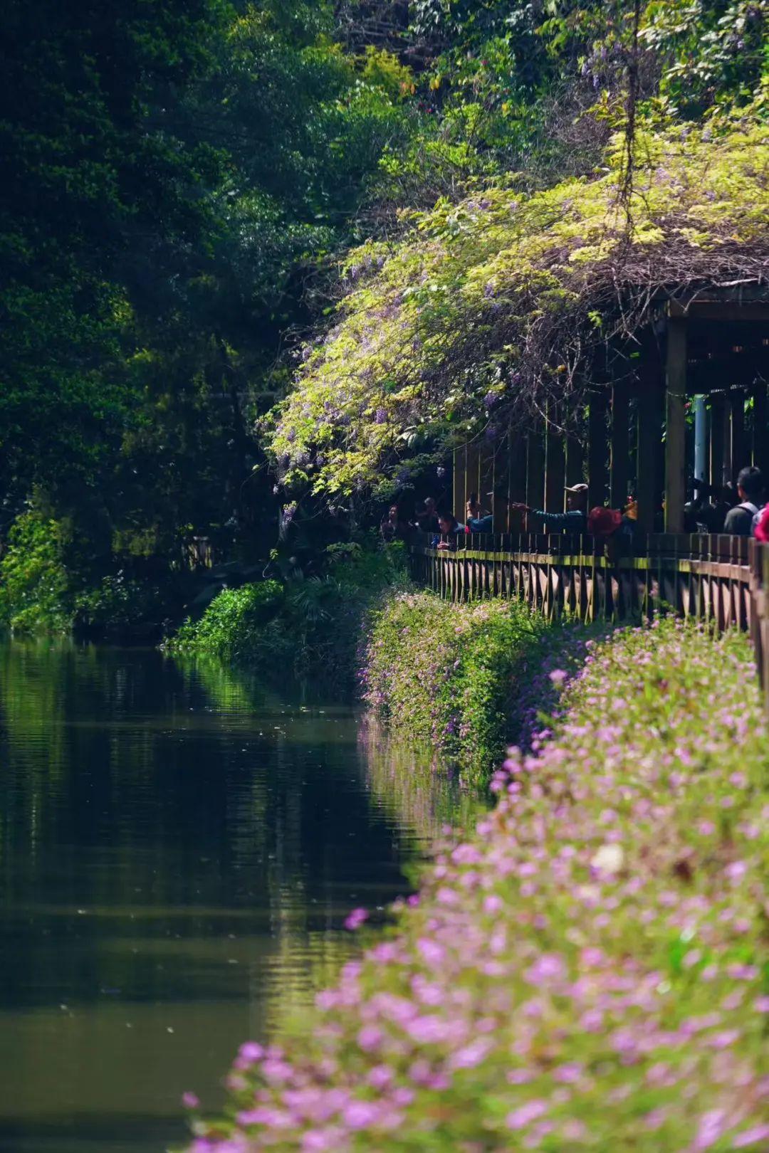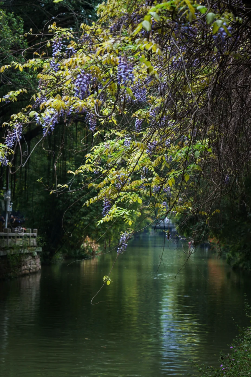 河岸的紫藤花仿若紫色的天河决堤
