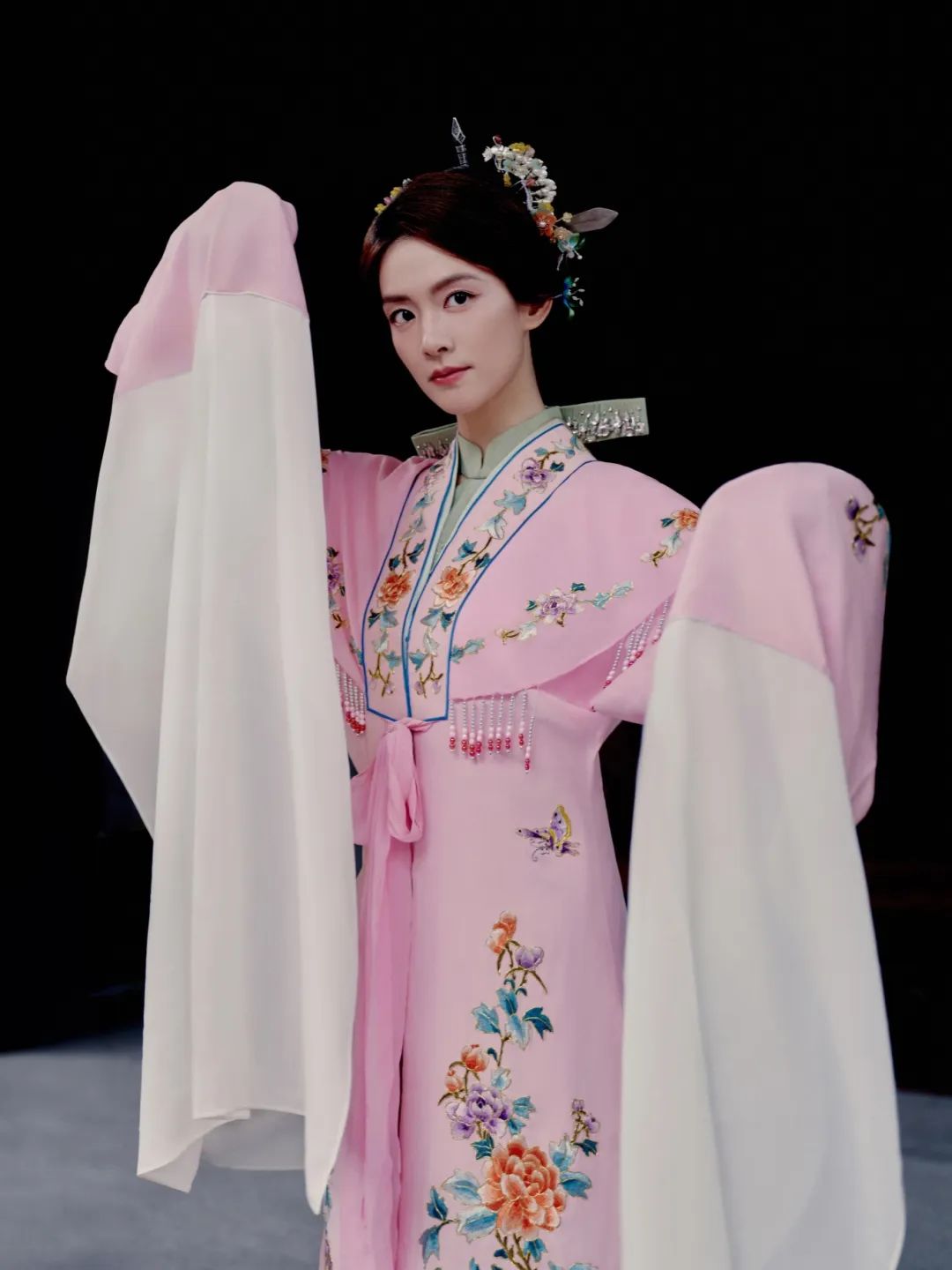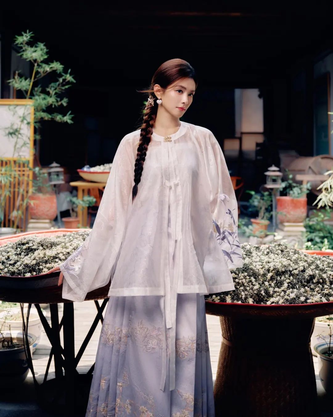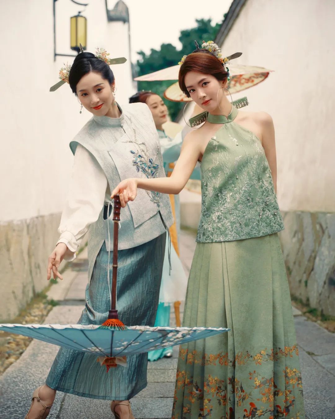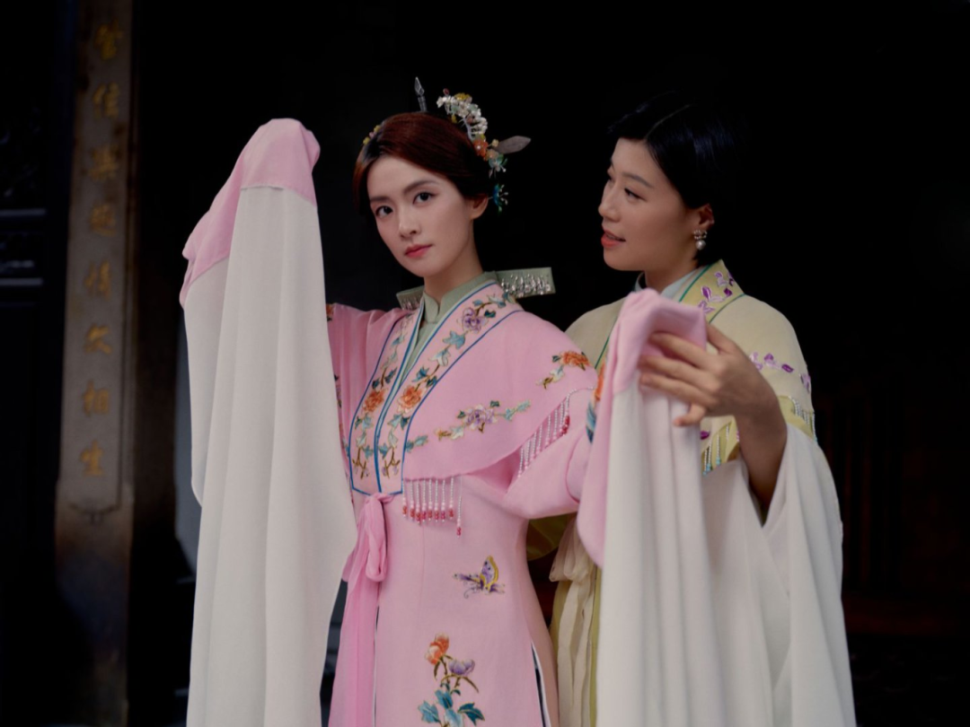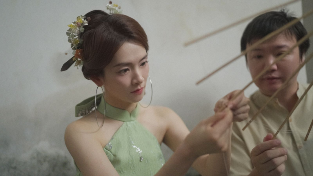 陈昊宇身着一袭传统风格服饰,体验了三条簪妆束。三条簪由三条银簪组成,头上挽一髻,插三条扁平如剑的银簪,主簪刀刃向下,左右副簪交叉,刀刃向外,“刀光簪影”间尽显闽都女子的刚柔并济。