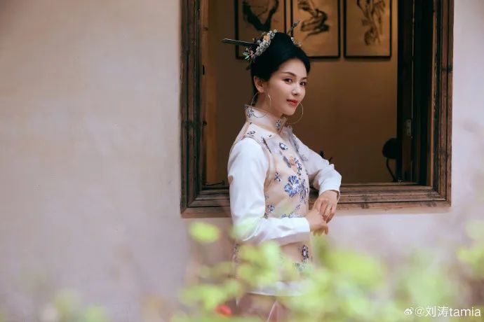 她驻足古厝雕花窗前