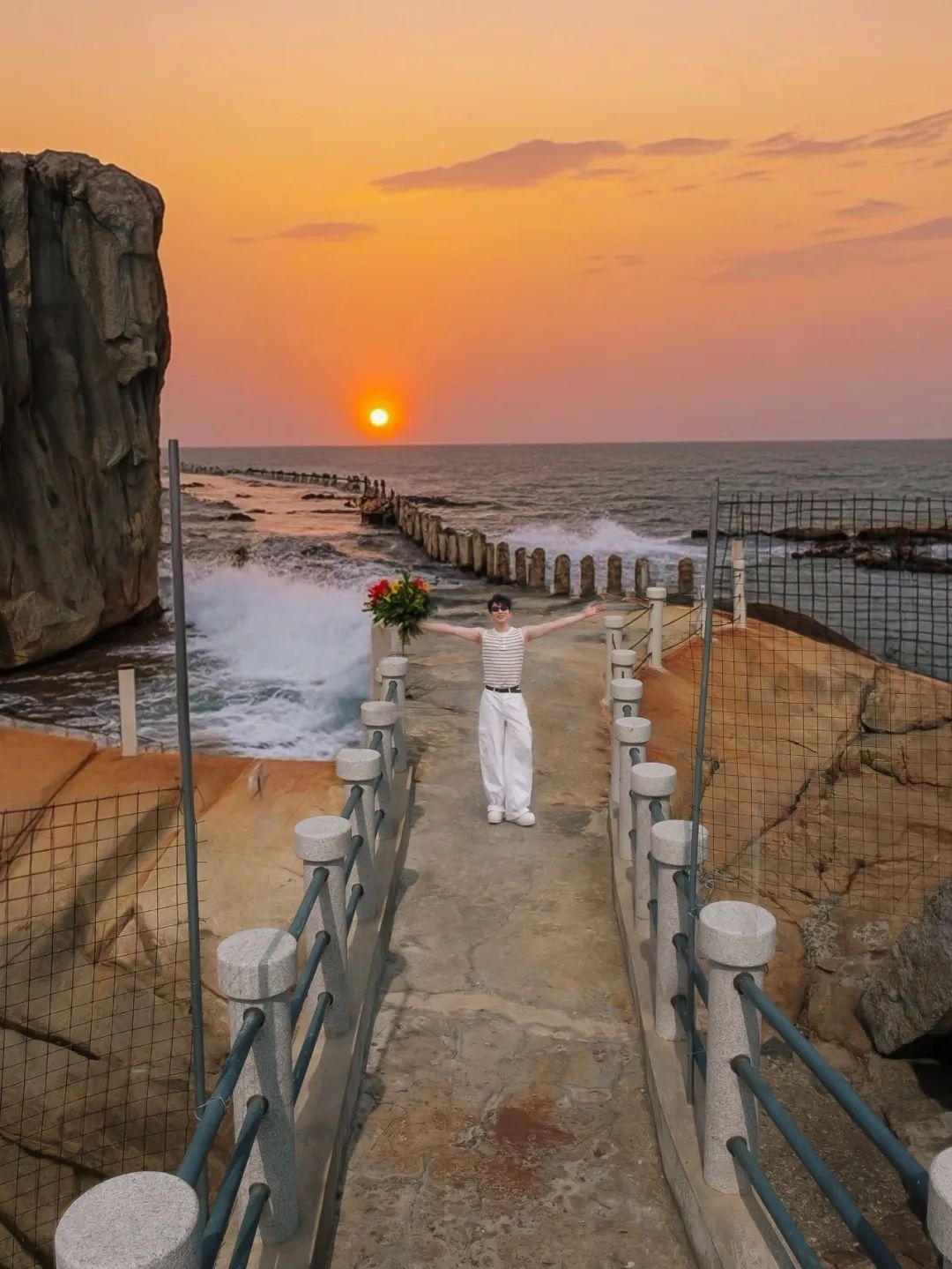 夕阳时分,天空被晕染成橘粉色,湛蓝的海面也泛起金色的涟漪。不远处的王母礁伫立在海面上,黄色礁岩与欢腾的浪花,以壮阔的碧海蓝天为幕布,在眼前铺展成一幅瑰丽的画卷。