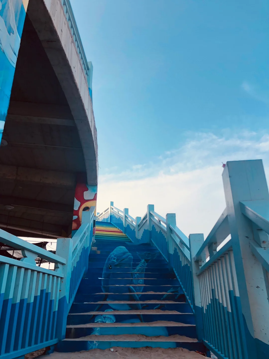 这里五颜六色的消波块像一道彩虹,被称为 “彩虹堤坝”,色彩明艳,特别适合拍照。海边建筑上的涂鸦墙,与大海、海滩、建筑巧妙融合,营造出别具一格的观海体验。