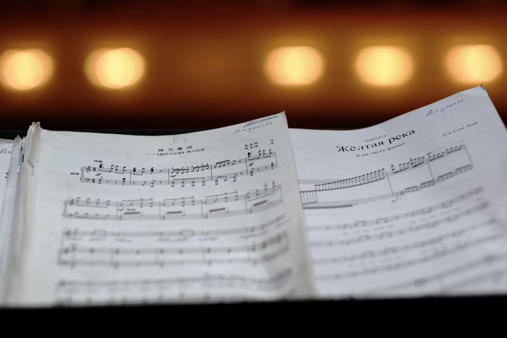 6月12日,在哈萨克斯坦阿拉木图江布尔国家音乐厅拍摄的《黄河大合唱》中、俄文曲谱。新华社记者 郑开君 摄