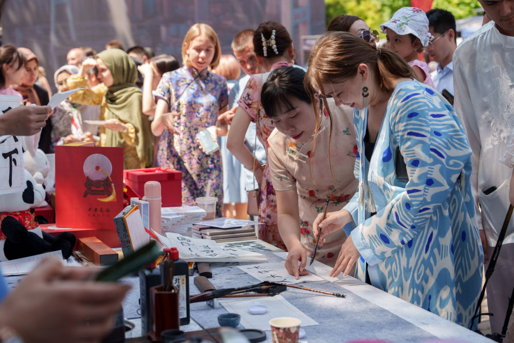 2023年5月27日,人们在乌兹别克斯坦塔什干中央公园举行的“茶和天下·雅集”活动上体验中国书法。