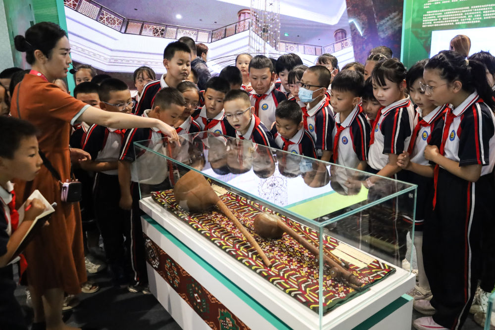 2023年9月7日,在甘肃敦煌举行的第六届丝绸之路(敦煌)国际文化博览会上,学生们参观土库曼斯坦专题展。