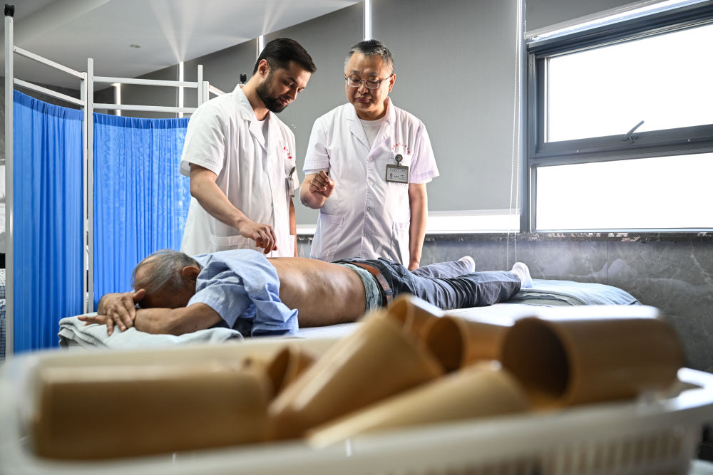2025年4月18日,在南京中医药大学第二附属医院针灸康复科,李小龙(后左)在导师张建斌指导下给患者行针。南京中医药大学2023级针灸推拿专业的硕士研究生阿米尔中来自塔吉克斯坦首都杜尚别。中学时,他爱上了中国文化,给自己取了个中文名字“李小龙”。他刻苦学习中文,参加汉语桥中学生中文比赛,后来多次来到中国,与中医结缘。2015年,李小龙到北京中医药大学学习针灸推拿,毕业后回到杜尚别开了自己的中医诊所。2023年,为了进一步提升自己,李小龙来到南京中医药大学攻读硕士研究生。“今后,我希望把中医带到更多的国家,让更多人感受中医的妙处。”
