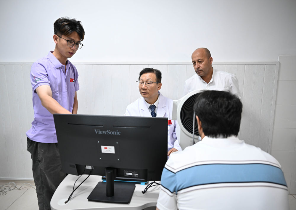 2025年5月31日,在塔吉克斯坦杜尚别,中国眼科专家党光福(中)在防盲合作中心为当地市民做眼科检查。当日,“健康快车中塔防盲合作中心”在塔吉克斯坦首都杜尚别开始运营。该中心旨在加强中塔两国眼科医疗合作,促进双方眼科医护人员互访培训和学术交流,将惠及更多眼疾患者。