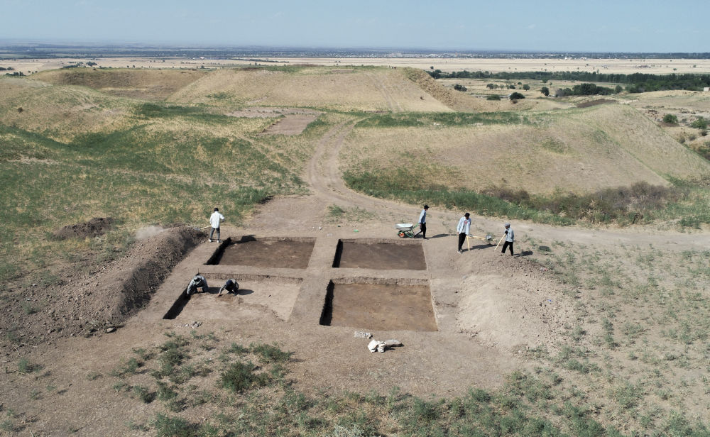 2023年8月9日,考古人员在中哈联合考古项目拉哈特遗址探方上工作(无人机照片)。从2017年开始,陕西省考古研究院与哈萨克斯坦伊塞克国家历史文化博物馆组成联合考古队,对拉哈特遗址及附近相关遗址开展考古调查与发掘工作。