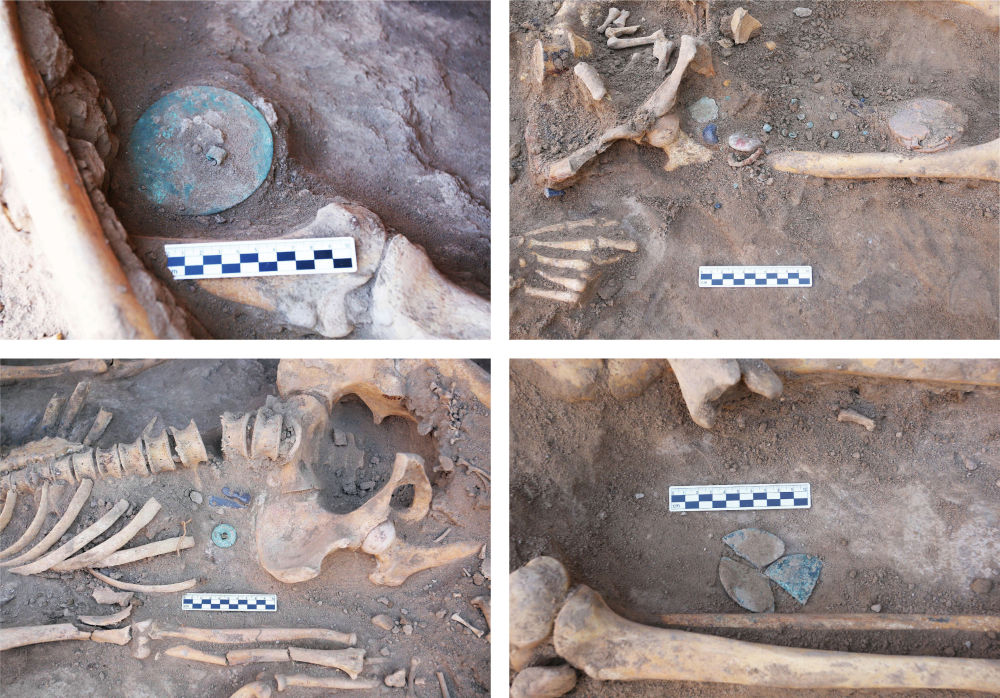 乌兹别克斯坦蒙扎铁佩遗址M7随葬品出土情况(拼版资料照片)。2024年,中乌联合考古队在蒙扎铁佩遗址考古发掘取得了重要收获。2025年2月,“中国社会科学院考古学论坛·2024年中国考古新发现”在北京中国历史研究院举行。论坛上公布了由中国社会科学院考古研究所中亚考古队参与发掘的乌兹别克斯坦蒙扎铁佩遗址考古成果。新华社发(考古杂志社供图)