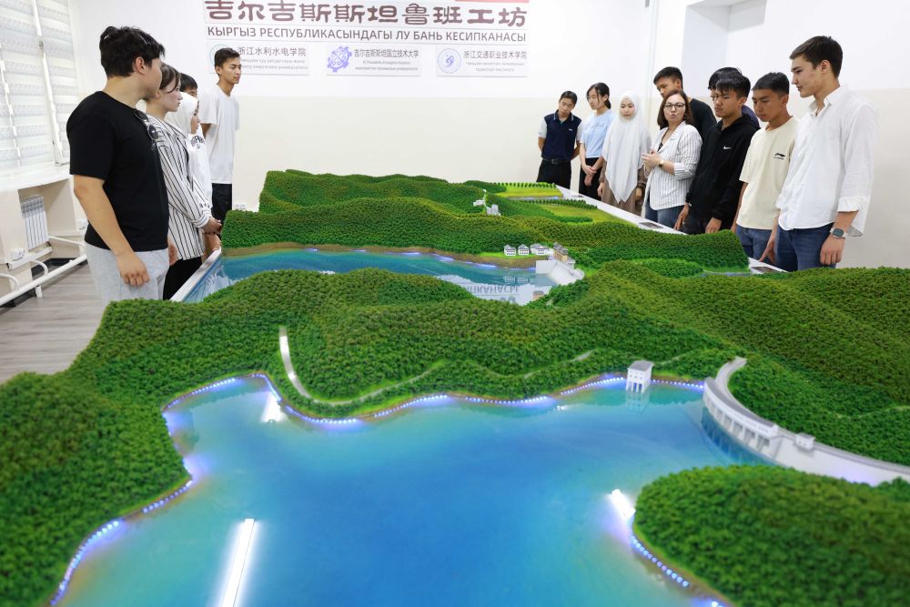 2025年6月4日,学生在吉尔吉斯斯坦首都比什凯克的鲁班工坊水利枢纽工程模拟演示实验室学习水电站知识。这家鲁班工坊由浙江水利水电学院与吉尔吉斯斯坦国立技术大学等联合建设,投入运行半年多来,已有4000多名学生在这里接受技术培训。