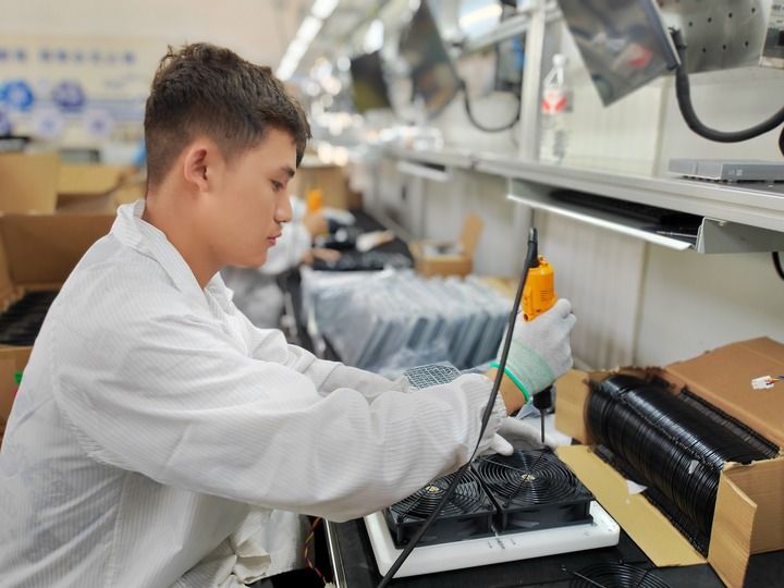 2025年5月16日,闽宁镇闽宁产业园,星汉智能科技(宁夏)有限公司的工人正在生产线上组装产品。新华每日电讯记者任玮 摄