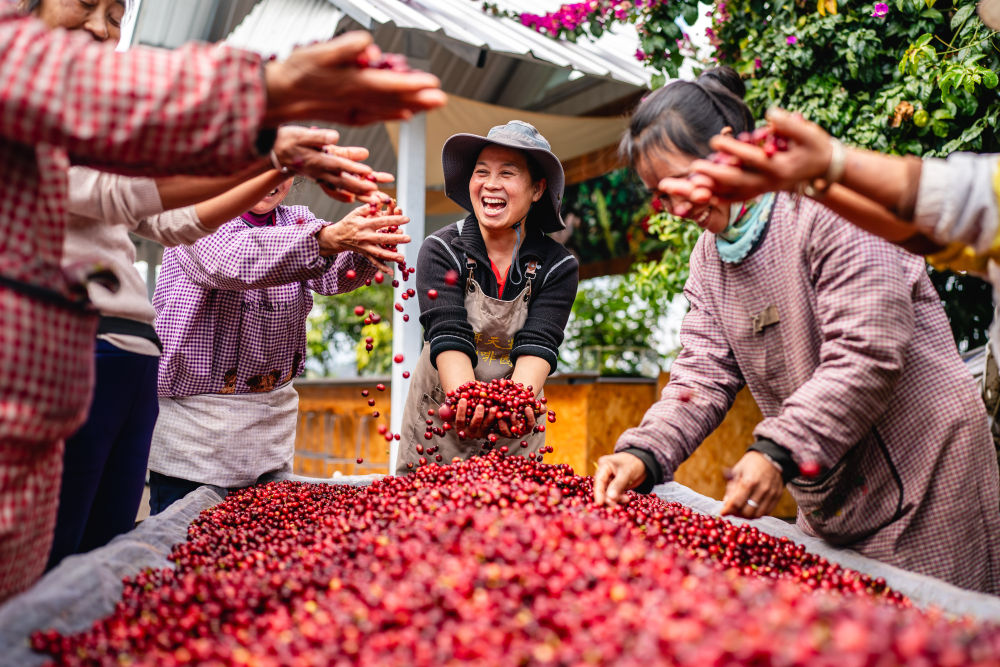 在云南省普洱市思茅区天玉咖啡庄园,庄园经营者玉吨(中)和工作人员庆祝咖啡丰收(2025年1月8日摄)。新华社记者 胡超 摄