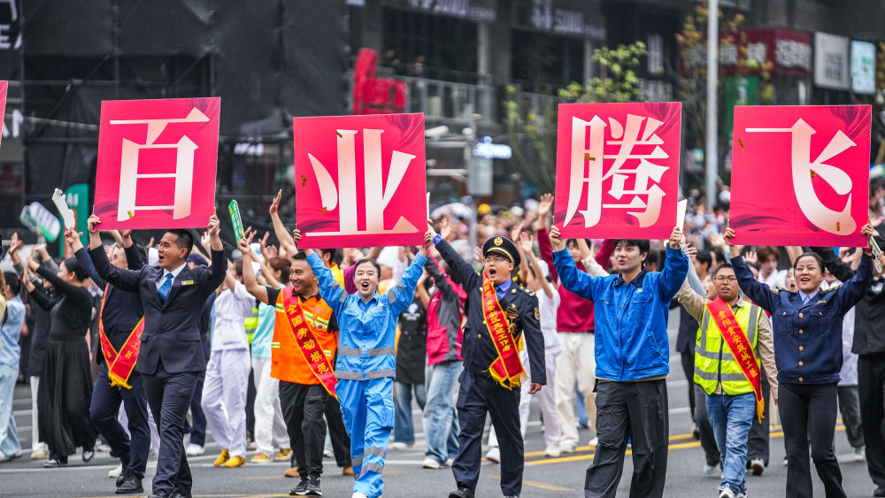 2025年5月18日,贵州民族团结大巡游活动在贵州省贵阳市举行。这是奋斗之光方阵的表演队伍在进行巡游。新华社记者 陶亮 摄