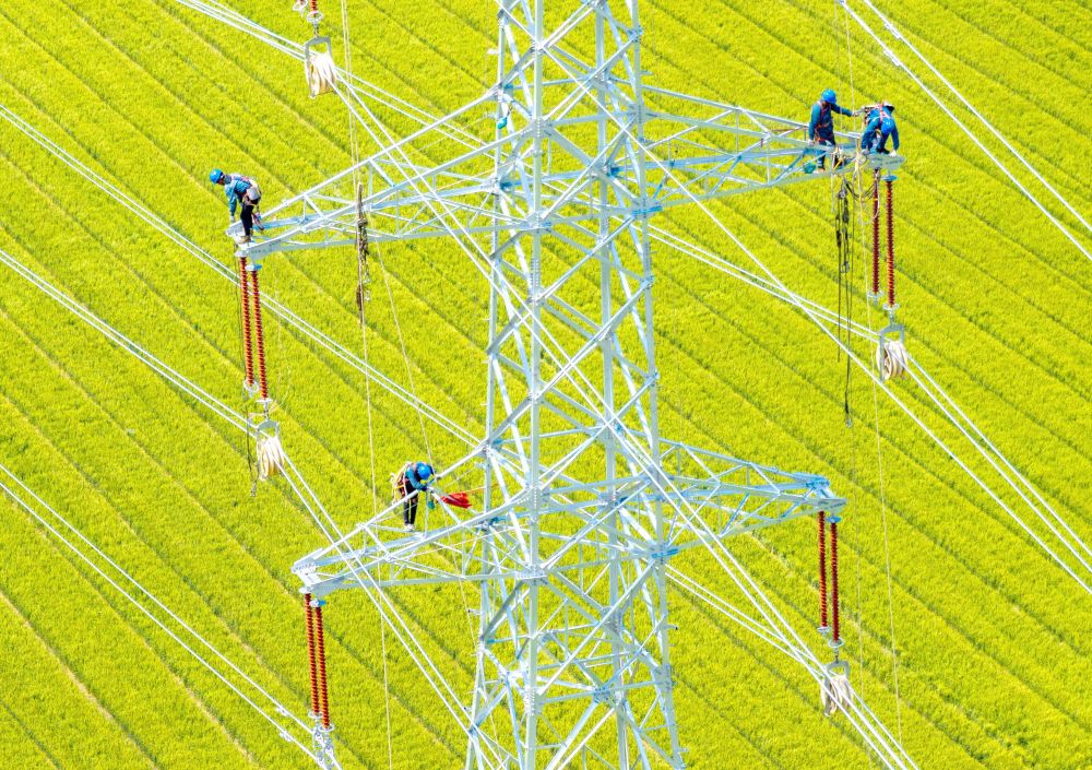 2025年5月4日,电力施工人员在江苏省扬州市江都区武坚镇至江苏省兴化经济开发区的220千伏华电武坚25万千瓦集中式光伏项目配套输电线路上作业(无人机照片)。新华社发(任飞摄)