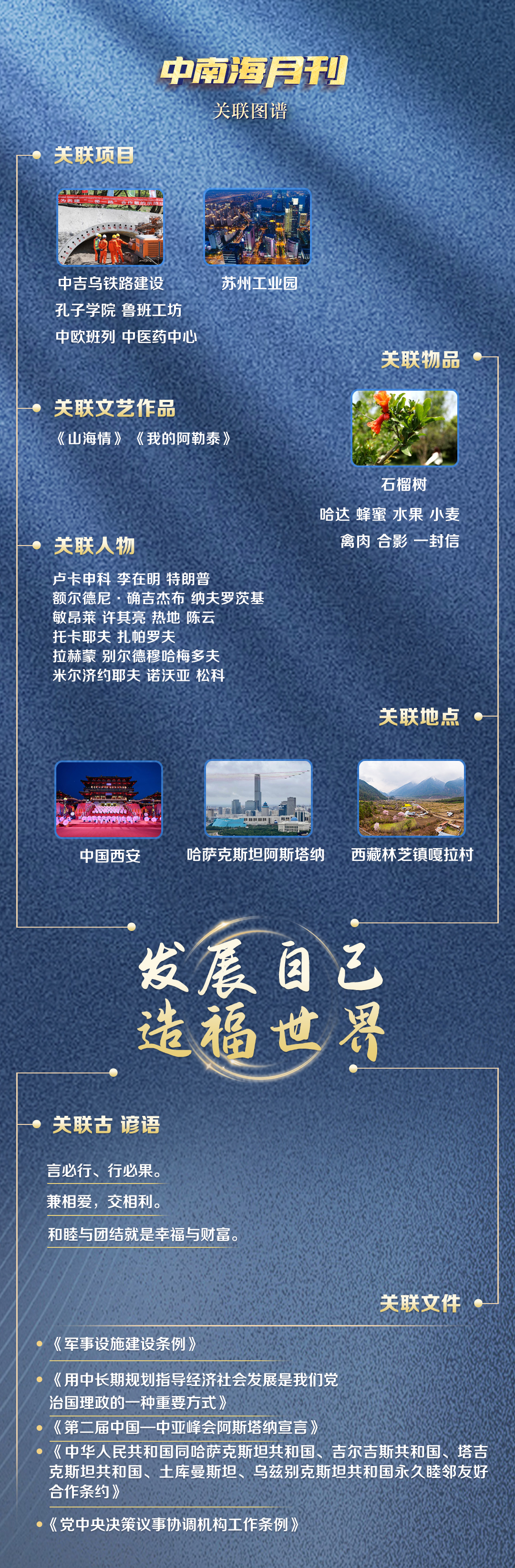 关联图谱中西安、阿斯塔纳两个地点,因中国与中亚五国的特殊情谊,有了别样意义——两年前,首届中国—中亚峰会在古丝绸之路起点西安举行。两年后,第二届中国—中亚峰会来到哈萨克斯坦首都阿斯塔纳,这里正是共建“一带一路”的首倡之地。
