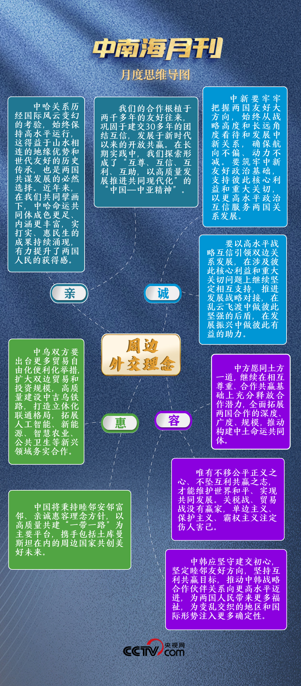 山水相连,唇齿相依。4月东南亚之行、5月访问俄罗斯、6月赴中亚,今年以来习近平主席三次出访都聚焦周边国家。正如习近平主席常说:“亲戚越走越近,朋友越交越深。”