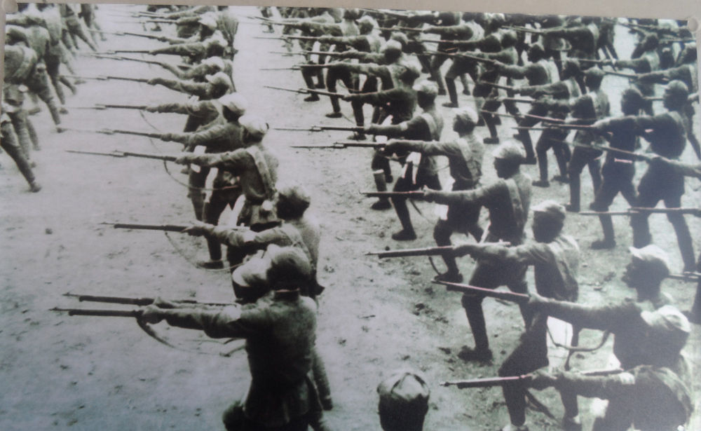 百团大战中,隶属于山西青年抗敌决死队第一纵队的25团8连奋勇杀敌,打破了八路军拼刺刀拼不赢日军的神话。1940年11月,八路军总部授予8连“白刃格斗英雄连”荣誉称号。这是抗战时期,8连官兵苦练刺杀(资料照片)。