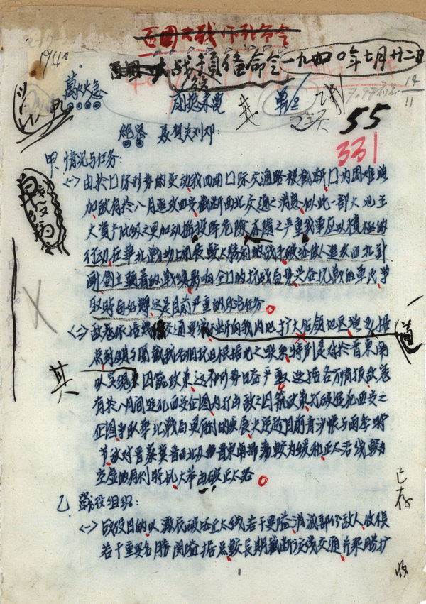 为粉碎侵华日军的“囚笼政策”、遏制国民党顽固派的妥协投降逆流,1940年8月至翌年1月,中国共产党领导的八路军在华北发动了百团大战。百团大战第一阶段以破袭正太铁路为重点,这是1940年7月22日签发的破袭正太路战役预备命令(中央档案馆提供)。