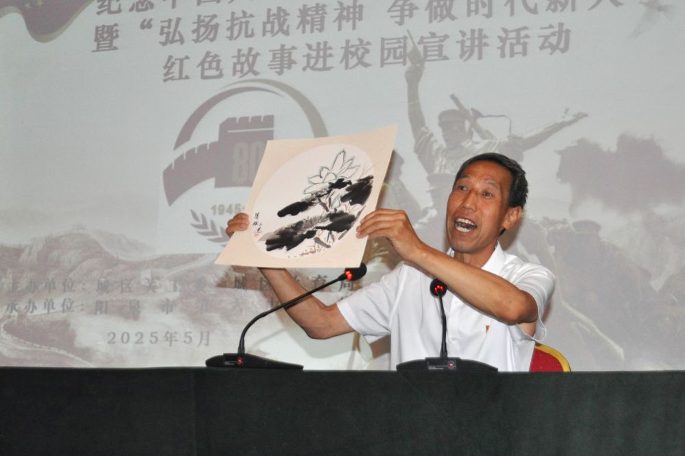 出生在阳泉市正太铁路破袭战沿线区域的姚永田,从小听抗战故事长大。他利用课余时间研究家乡抗战史、编写校本教材,并在校园义务宣讲红色故事100余场,努力让红色精神在年轻一代心中生根发芽。这是2025年5月26日,姚永田在阳泉市第六中学为学生们宣讲。