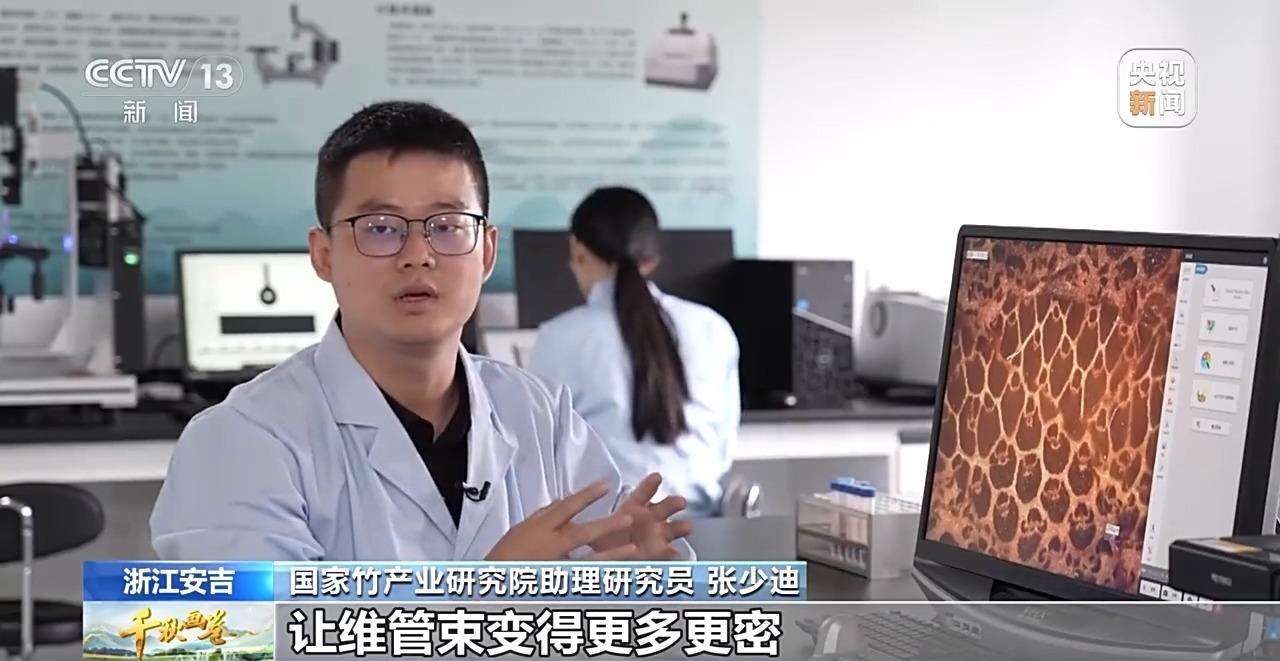 在安吉孝丰镇的国家竹产业研究院里,来自北京的研究团队就地取材,要把容易弯折的竹子,变成钢铁般坚韧的新材料。