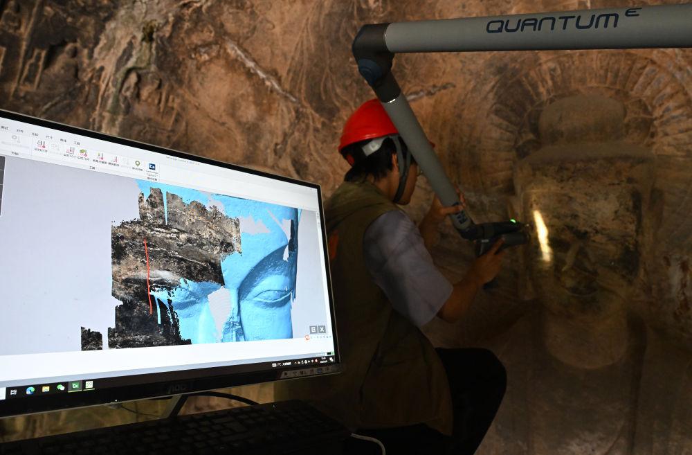 2025年4月9日,武汉大学文化遗产智能计算实验室团队成员在河南洛阳龙门石窟魏字洞使用关节臂扫描仪对佛像进行数字化扫描。从2005年起,龙门石窟研究院开始为龙门石窟建立数字化档案,借助激光扫描、高清摄影等技术手段收集文物数据,以数字的形式留存千年石刻群的风貌,致力于让这一规模宏大、气势磅礴的石窟瑰宝“芳华永驻”。