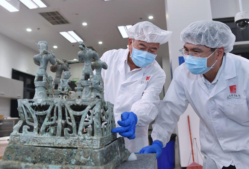2023年5月30日,在四川三星堆博物馆文物保护和修复中心,文物修复师郭汉中(左)与同事讨论神坛底座修复方案。郭汉中从事文物修复工作已40余年,深度参与了三星堆祭祀坑的发掘工作,累计修复文物6000余件。“大概还有上万件文物等着修复,需要一代接着一代往下干。”郭汉中说,他要把平生所学传承下去,培养更多人才。