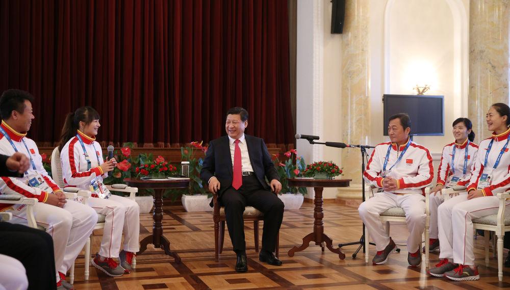 2014年2月7日,中共中央总书记、国家主席、中央军委主席习近平在俄罗斯索契亲切看望参加第二十二届冬季奥林匹克运动会的中国体育代表团。这是习近平在座谈会上与代表团成员亲切交流。新华社记者 兰红光 摄