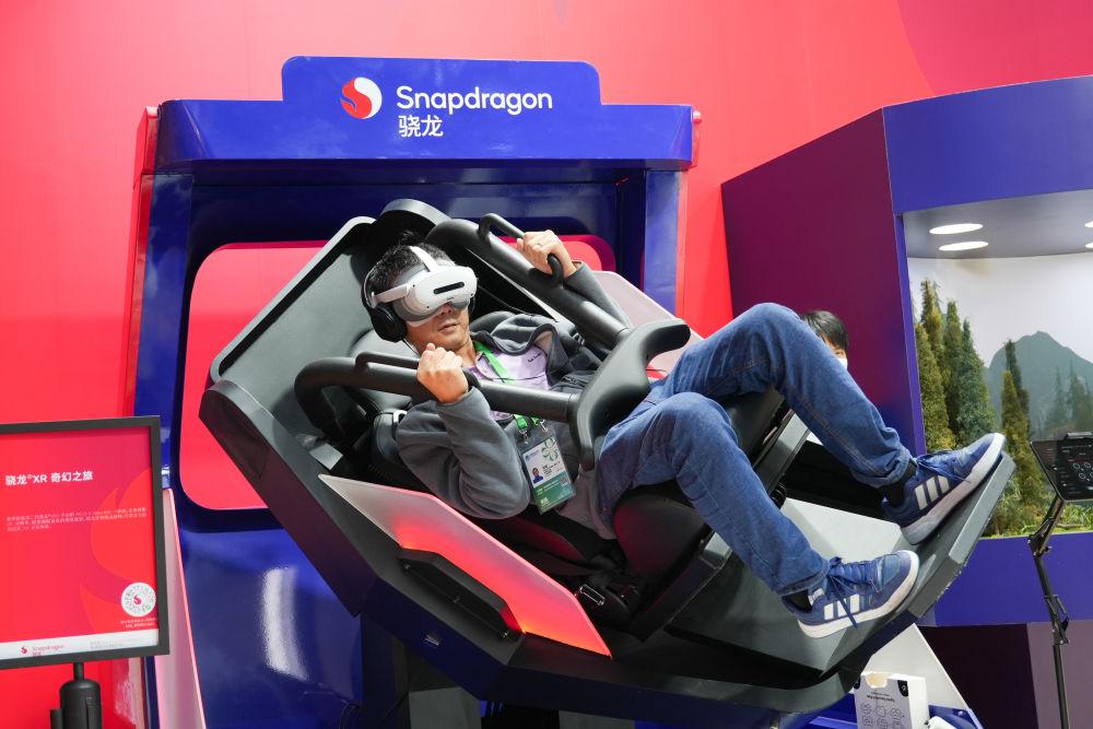 11月6日,参观者在第八届进博会技术装备展区高通展台体验XR设备。本届进博会展示科技、工业、医疗等领域的高端装备、前沿技术和创新产品,致力于引领行业创新趋势。
