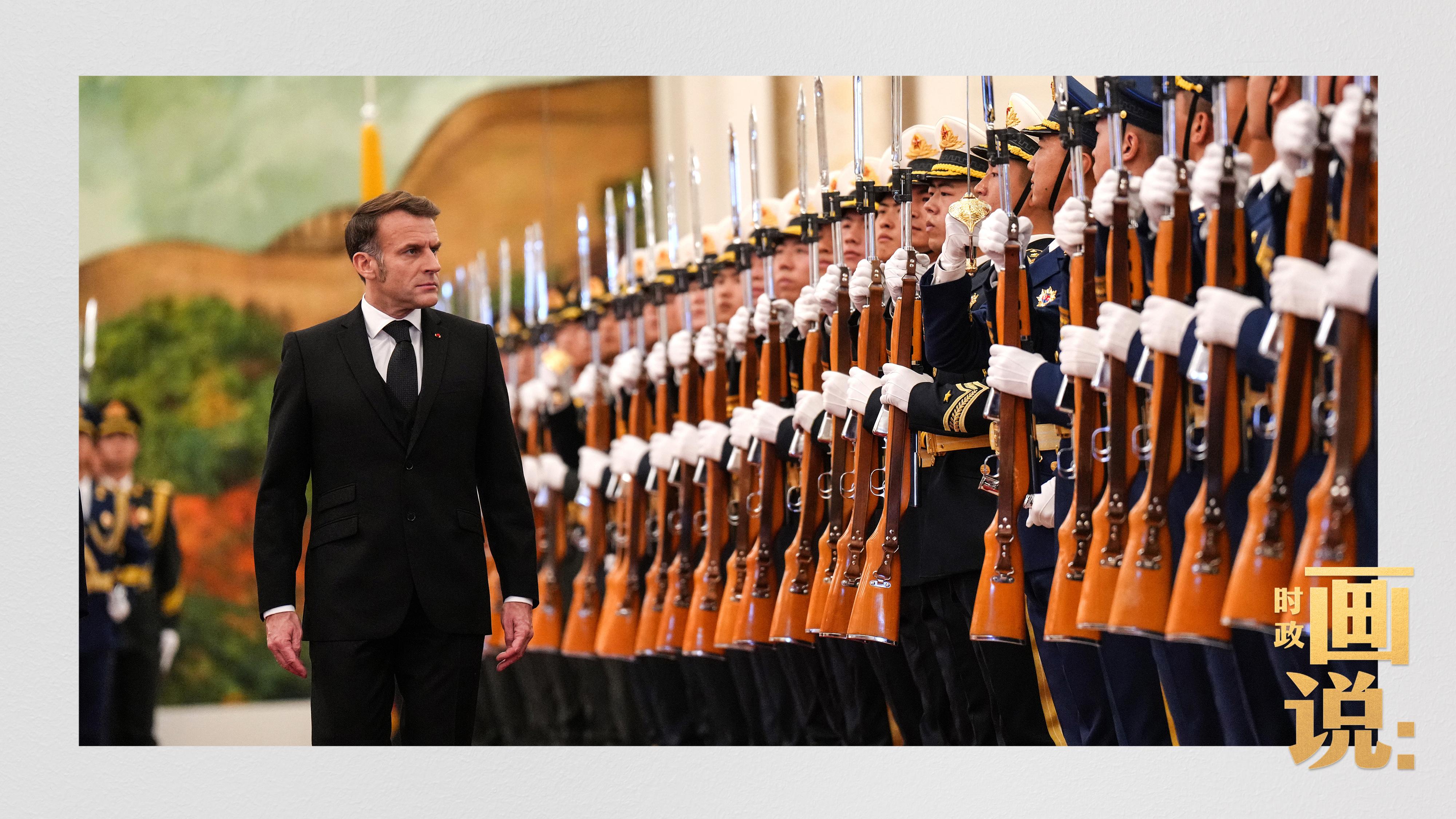 △马克龙在习近平陪同下检阅中国人民解放军仪仗队并观看分列式