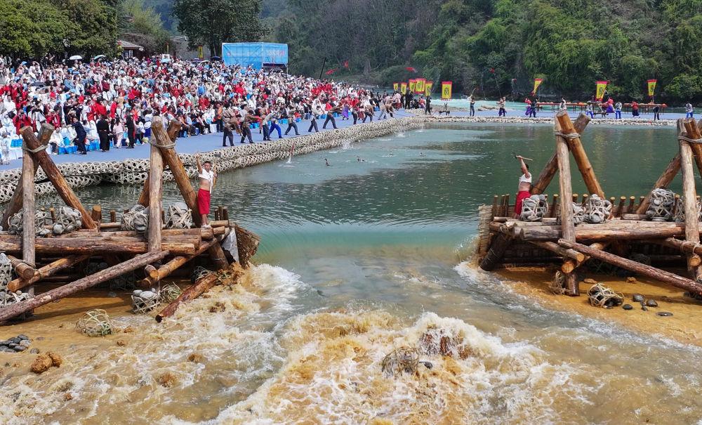 2025年4月4日都江堰放水节,堰工砍断杩槎的绳索后,岷江水奔流而下。新华社记者 江宏景 摄